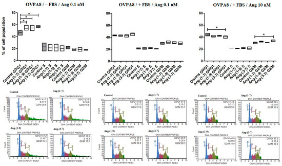 The Muse Cell Cycle Assay results following the incubation (48 h) of OVPA8 cells with tested angiotensins in the medium with or without FBS (mean ± SD; one-way ANOVA with Tukey’s test: * p < 0.05).