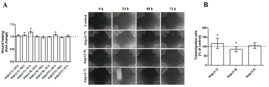 (A) The Wound Healing Assay and (B) Boyden Chamber Assay results, following the incubation (48 h) of OVPA8 cells with tested angiotensins in the medium without FBS (mean ± SD; one-way ANOVA with Tukey’s test: * p < 0.05).