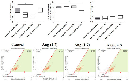 The effect of angiotensin peptides on MAPK activation was analyzed by flow cytometry assessing the expression of phosphorylated ERK1/2 (Thr202/Tyr204, Thr185/Tyr187) in OVPA8 cells. The percentage of inactivated cells decreased after 48 h incubation with 0.1 nM Ang-(1-7) and Ang-(1-9) but significantly only for the last one. Ang-(3-7) caused a slight change but significantly decreased the percentage of activated ERK1/2 in ovarian cancer cells (Figure 5).