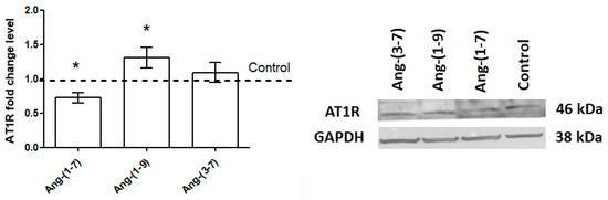 Western blot showing AT1R protein expression after incubation (48 h) of OVPA8 cells with tested angiotensins in the medium without FBS (mean ± SEM; one-way ANOVA with Tukey’s test: * p < 0.05).