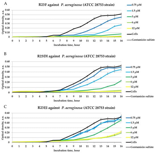 Inhibitory activity of peptides R23F (A), R23DI (B), R23EI (C) during 16 h of incubation with P. aeruginosa strain ATCC 28753 cells. A gentamicin sulfate concentration of 1700 μM was used as a positive control of the antimicrobial effect. ATCC 28753 cells without peptide were used as negative controls. The experiments were performed in three replicates. The results were expressed as the mean ± standard deviation (M ± SD).