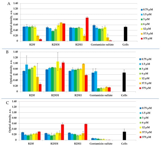 Inhibitory activity of peptides R23F (A), R23DI (B), R23EI (C) during 16 h of incubation with S. aureus strain 209P cells. A gentamicin sulfate concentration of 1700 μM was used as a positive control of the antimicrobial effect. 209P cells without peptide were used as negative controls. The experiments were performed in three replicates. The results were expressed as the mean ± standard deviation (M ± SD).