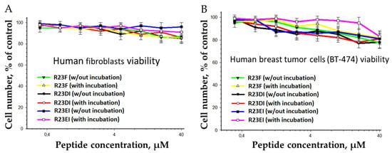 Effect of peptide treatment on the survival of human fibroblasts (A) and the breast tumor cell line BT-474 (B) without preliminary incubation (18 h, 37 °C, in DMEM with 10% FBS) and after 72 h of co-incubation with peptide. Each of the experiments was carried out at least three times (n ≥ 3). Error bars show standard deviation (SD).