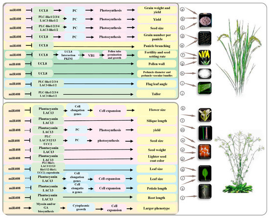The number of grains per panicle is largely associated with the morphologies of the panicle, including the number of primary and secondary branches in the panicle. In O. sativa, miR408 positively regulates grain yield by increasing the panicle branches and grain number through cleaving its target gene UCL8 [25]. In O. sativa, the overexpression of miR408 or the function loss of UCL8 significantly increased the number of panicle branches and the number of grains per panicle, but the overexpression of UCL8 dramatically reduced the number of panicle branches. In contrast, the overexpression of UCL8 dramatically reduced the effective number of grains per panicle [25]. In conclusion, miR408 negatively regulates UCL8 to affect seed size, seed weight and seed number to ultimately control grain yield in O. sativa. Similarly, miR408 negatively regulates PLC and LAC13 to affect seed size, seed weight, silique length and seed number to ultimately control grain yield in A. thaliana.