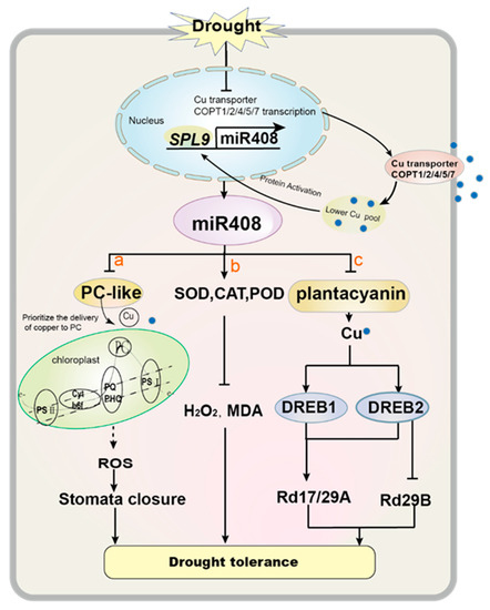 In total, the mechanisms of miR408 in improving drought tolerance are summarized as follows (Figure 5): (1) Under drought stress, the internal Cu content of flag leaves decreases, which may be due to differences in Cu transporters. Then, lower Cu leads to the up-regulation of miR408 via the transcription factor OsSPL9. Elevated miR408 levels down-regulate target genes encoding Cu-containing proteins (PLC), and then cause cellular Cu to be preferentially distributed to PCs, thereby maintain PC activity and electron transport. The electron transport pathway is one of the main ROS production pathways. Finally, ROS promotes the closure of stomata in response to drought stress (Figure 5a) [39,71]. (2) miR408 enhances the activities of SOD, CAT and POD, leading to a decrease in ROS accumulation, thereby improving drought tolerance (Figure 5b) [93]. (3) miR408 down-regulates the target gene PLC, leading to an accumulation of Cu levels, and DREB levels increase when Cu is excessive. Subsequently, the DREB2A target gene RD29B is down-regulated, while the DREB1A and DREB2A transcription factor target genes RD17 and RD29A are up-regulated. Finally, DREB1A and DREB2A t and their target genes RD17 and RD29 provide plant survival tolerance under drought stress [75].