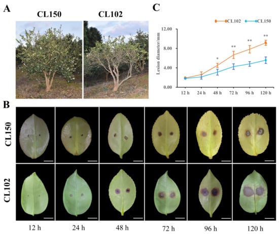 (A) Growth of CL150 and CL102 in the field. (B) Phenotype of CL150 and CL102 after inoculation with Co. gloeosporioides, Scale bar = 1 cm. (C) Leaf lesion size over time of CL150 and CL102 after inoculation with Co. Gloeosporioides, n = 12; “*” and “**” indicate significant differences at p < 0.05 and p < 0.01, respectively.