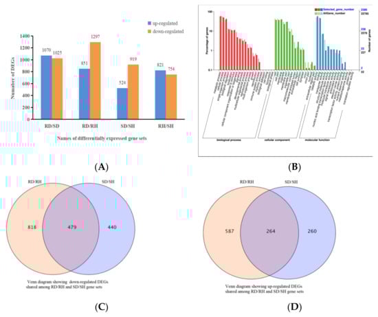 (A) Number of up/down-regulated DEGs between the four groups (RD/SD, RD/RH, SD/SH and RH/SH); (B) GO functional enrichment analysis of DEGs; (C) Venn diagram showing down-regulated DEGs shared among RD/RH and SD/SH; (D) Venn diagram showing up-regulated DEGs shared among RD/RH and SD/SH.