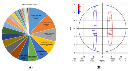 (A) Sector graph of metabolite classification. (B) OPLS-DA scatter plot of resistant line sample infected or uninfected with Co. gloeosporioides.