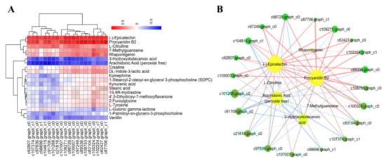 The Pearson correlation algorithm was used to calculate the correlation between genes and metabolites using the relative content data from the two analyses. A correlation heat map was drawn for the top 20 results (Figure 5A). The DEGs (c92807.graph_c0, c107374.graph_c1, c97836.graph_c0, c98696.graph_c0, c104815.graph_c1, c91708.graph_c0, c101266.graph_c0, c21818.graph_c0, c107007.graph_c0, c108271.graph_c0, c98729.graph_c0, c105007.graph_c0, c97249.graph_c0, c89336.graph_c0, c108753.graph_c0, c83104.graph_c0, c1000324.graph_c0, c102224.graph_c1, c62427.graph_c0, c87706.graph_c1) were positively correlated wich —(-) epicatechin, procyanidin B2, 3-hydroxydodecanoic acid and arachidonic acid (peroxide free). These associations were confirmed by association network diagram (Figure 5B).