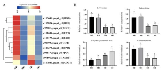 (A) Expression of DEGs in tyrosine metabolism pathway among the four sample groups, data of each row was standardized. (B) Relative concentration of four DAMs in tyrosine metabolism pathway among the four sample groups, different letters represent significant difference at p < 0.05 by Duncan.