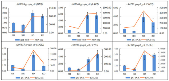 To verify the credibility of the expression levels obtained from the RNA-seq data, qRT-PCR was used to evaluate the transcription levels of six differentially expressed flavonoid-related genes (Figure 8). The expression trends of DFR (c105598.graph_c0), LAR1(c91998.graph_c0), LAR2 (c101266.graph_c0), CHS (c96212.graph_c0), ANR (c109855.graph_c0) and FLS (c96930.graph_c0) were highly consistent with the transcriptome data. These results supported the reliability of RNA-seq data.