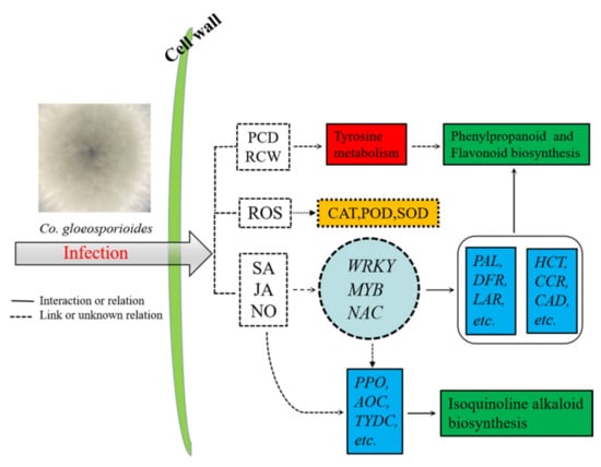 In plants, phenylpropanoid metabolism is one of the most important secondary metabolic pathways. Plants have evolved a variety of branches of phenylpropanoid metabolism, producing flavonoids, lignans, cinnamic acids, amides and other metabolites. These secondary metabolites play important roles in plant-pathogen interactions [32,33]. Among them, catechins are a widely distributed class of flavonoids, and the biosynthetic pathways of epicatechin and (+)-catechin are basically clarified [34]. The DEGs and DAMs from our omics datasets were mapped to the KEGG pathways and drawn as a network of genes and metabolites. The phenylpropanoid pathway begins with three key enzymes: phenylalanine ammonia-lyase (PAL), trans-cinnamate 4-monooxygenase (C4H), 4-coumarate-CoA ligase (4CL). In this study, PAL, C4H and 4CL genes were all highly expressed after Co. gloeosporioides infection (Figure 7B). Naringenin can enter two branches through different enzymes: the phenylalanine metabolic pathway and the flavonoid metabolic pathway. The catalytic product of flavonoid 3-hydroxylase (F3′H) is the direct precursor of flavonols and the intermediate product of anthocyanins and catechins. The F3′H gene had the highest transcript levels in infected resistant leaves (Figure 7B). The degree of hydroxylation of the B-ring of flavonoids is closely related to the antioxidant function of the product [35]. Within the flavonoid pathway, dihydroflavonol 4-reductase (DFR) is a key enzyme for the synthesis of anthocyanins, catechins and proanthocyanidins and controls the flux through these three branches [36]. Two DFR genes were highly expressed after infection (Figure 7B). Leucoanthocyanidin reductase (LAR) and anthocyanidin synthase (ANS) compete for the same substrate (leucocyanidin). The leucocyanidins are converted into catechins or gallocatechins by LAR or into cyanidins, the precursors of epicatechins and epigallocatechins, by ANS. Our results showed that the LAR genes had higher transcript levels than the ANS gene. Anthocyanidin reductase (ANR) reduces anthocyanins into the corresponding epicatechins and epigallocatechins. An ANR gene (c109855.graph_c0) was obtained and showed the highest level of expression in infected leaves of the resistance and susceptible. Shikimate hydroxycinnamoyl transferase (HCT) catalyzes the transfer of the p-coumaroyl from p-coumaroyl-CoA to shikimate [37]. Two HCT genes showed opposite expression trends before and after infection; c110487.graph_c0 increased after infection, while c106589.graph_c0 decreased after infection. Other genes in these related pathways, such as CCR, CADs and F5H, showed consistent trends and were highly expressed after infection (Figure 7B).
