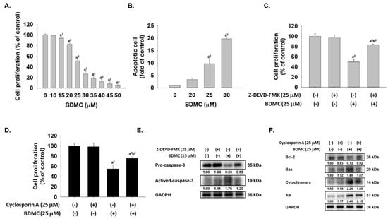 MTT assay was used to measure cell cytotoxicity, and flow cytometer was used to assay cell apoptosis. After, GBM 8401/luc2 cells were treated with various concentrations of BDMC for 48 h and cells assayed cell cytotoxicity and apoptosis, and results are shown in Figure 1A,B, which demonstrates that BDMC suppressed total viable cell number and the inhibitory rate was dose-dependently increased following BDMC treatment (p < 0.05). As presented in Figure 1A, after 48 h treatment, GBM 8401/luc2 cell population was inhibited at 17.36–95.60% with 15–50 μM BDMC. Annexin V was used to quantify GBM 8401/luc2 cell apoptosis after BDMC treatment, and results are shown in Figure 1B. After 48 h, BDMC treatment dose-dependently increased the cell apoptosis about 3–19 fold; thus, the cell apoptosis was significantly increased after treatment with BDMC compared with the control (p < 0.05). Cells were pretreated with or without Z-DEVD-FMK (caspase-3 inhibitor) or inhibitor of mitochondria membrane potential (cyclosporin A) and were treated with 0 and 25 μM of BDMC for 48 h. Cell proliferation was measured, and results were presented in Figure 1C,D. Figure 1C indicated that cells that were pretreated with Z-DEVD-FMK and then treated with BDMC experienced significantly increased cell proliferation up to 26% when compared to BDMC treatment alone. Results from Figure 1D also showed that cells were pretreated with cyclosporin A and then treated with BDMC significantly increased cell proliferation up to 14% when compared to BDMC treatment alone. Furthermore, BDMC decreased cell numbers and induced apoptosis were involved in apoptosis-associated protein, and cells were pretreated with or without Z-DEVD-FMK or cyclosporin A and then treated with 0 and 25 μM of BDMC for 48 h. Apoptosis-associated proteins were measured by western blotting, and results are presented in Figure 1E,F. Figure 1E indicates that the pretreatment of Z-DEVD-FMK and treated with BDMC led to an increase of pro-caspase-3 and decrease of active-caspase-3 when compared to BDMC treated only. Figure 1F indicates that the pretreatment of cyclosporine A and treated with BDMC led to an increase of Bcl-2 and decrease of Bax, cytochrome c and AIF when compared to BDMC treated only. Based on both results, BDMC induced cell apoptosis via affected apoptosis-associated proteins in GBM 8401/luc2 cells