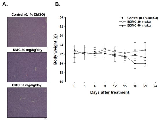 The results shown in Figure 3A indicate that treatment with BDMC at 30 and 60 mg/kg did not lead to liver pathology change as compared to the control group. Besides, in Figure 3B, no statistically significant differences in body weight of mice were found in the treated or control group. These results suggested that BDMC may not induce general toxicity of mice, including acute or delayed toxicity.