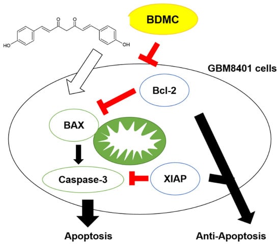 Both Bcl-2 apoptosis regulator (Bcl-2) and X-linked inhibitor of apoptosis protein (XIAP) were recognized as anti-apoptosis factors that contribute to tumor progression, while Bcl-2-associated X (BAX) and caspase-3 were known as apoptosis markers. In Figure 7, we demonstrated the potential mechanism for BDMC-induced inhibition of tumor progression is through blockage of Bcl-2 and XIAP and the promotion of BAX and caspase-3 cleavage in vivo.