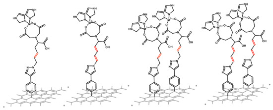 The general approaches to such modifications involve two main strategies. The first consists of the physical adsorption of molecules on the surface of graphene, which maintains its conjugated structure [15,16,17], as well as efficient charge mobility [23,24]. The drawback of this approach is the fact that non-bonding interactions (such as van der Waals, π–π, hydrophobic) are weaker than chemical bonds and may not ensure interface stability with the risk of losing the functionalization over time. The second strategy, namely chemisorption, leads to a durable connection thanks to the creation of a chemical bond between graphene and the molecule, ensuring the high stability of the system and preserving the electron transfer characteristic [25,26]. Yet, in this way, local disruptions of the graphene lattice (due to the formation of the chemical bond and the sp3 hybridization) might lead to a substantial reduction of the charge mobility. According to our previous studies, pyrene-nitrilotriacetic acid derivatives coordinated with metal dicatations, such as Ni2+ or Co2+ have proven to be a promising choice when creating a physisorbed SAM-graphene interface with a controllable direction of electron flow [27,28].