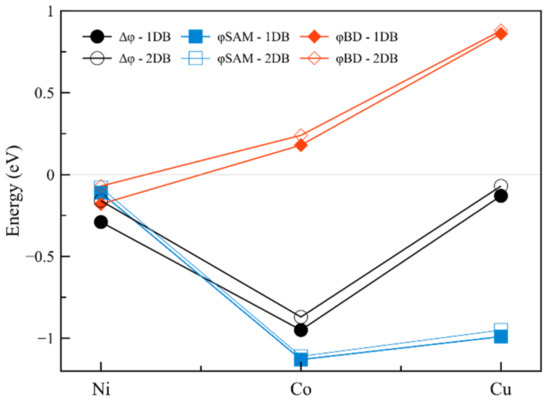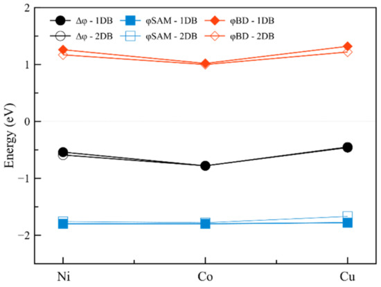 The leveling effect of full coverage is also reflected on the φBD, which now has nearly the same positive values. This behavior has the greatest impact for nickel-containing interfaces, since for (Ni-1DB)2 and (Ni-2DB)2 this contribution has a positive value, countering the negative value of φSAM. Such behavior is completely different from that of the half-covered systems, where both contributions are negative. For (Co-1DB)2, (Co-2DB)2, (Cu-1DB)2 and (Cu-2DB)2 no change in φBD sign is observed, although there is an increase in its absolute value.
