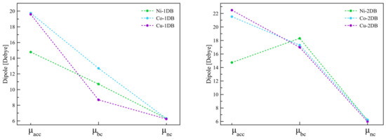 The contribution arising from the dipole moments of the backbones is approximately equal to −1.80 eV for all studied interfaces (Figure 4, blue lines), with the most outlaying value of −1.67 eV for (Cu-2DB)2. However, the highest increase in φSAM, of 16 and 22 times, is observed for (Ni-1DB)2 and (Ni-2DB)2 respectively. This phenomenon can be explained when changes in dipole moments due to depolarization effects are taken into account. In order to clarify them, three parameters are considered: µacc, µbc and µnc (µaccumulated, µbig-cell, µnormal-cell). µacc is obtained by summing the values of dipole moments calculated for isolated SAM molecules in the gas phase; µbc is calculated when two SAM molecules are placed together, inside an enlarged unit cell (i.e., dimer in the gas phase). Finally, µnc is obtained for the SAM molecules, when the size of the unit cell is retained. The reason why µacc has the highest values is the lack of intramolecular interactions within the molecules (Figure 5, µacc). A strong depolarization caused by dimer interactions can be observed, hence the value of the µbc is lower than the corresponding value of µacc (Figure 5, µbc). The highest reduction of 56% in dipole moments is observed for (Cu-1DB)2 (all depolarization values are reported in Table S2). Depolarization is even stronger when all intramolecular interactions are present. Considering the decreasing tendency in the values of dipole moments, it is clear that in the case of introducing the second molecule into the unit cell, depolarization plays the greatest role, eliminating all influences of the metal ion or the degree of saturation. Since for all systems the final dipole moment, µnc, is practically identical, the molecular component will also have similar values. However, one cannot rule out the possibility that the rather small dimensions of the cell may contribute to the alignment of the dipole values, which might differ in a larger cell.