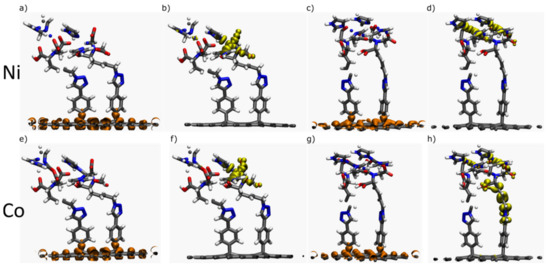 Shapes of HOCO (orange) and LUCO (yellow) molecular orbitals for (Ni-1DB)2 (a,b), (Ni-2DB)2 (c,d), (Co-1DB)2 (e,f) and (Co-2DB)2 (g,h). For DOS projected over onto corresponding fragments see Supplementary Materials (Figures S10–S15).
