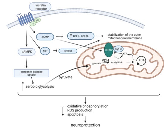 The underlying mechanism responsible for the beneficial effect of incretins in Alzheimer’s disease. Incretin receptor activation may include stabilization of the outer mitochondrial membrane, prevention of cytochrome c (CytC) efflux into the cytoplasm, and reduction of apoptosis and oxidative stress through activation of cAMP and other kinases. Together with ATP, the cAMP-dependent, protein kinase A (PKA) signaling pathway can regulate cytochrome c oxidase (COXIV) activity and mitochondrial function []. It can also activate AMP-activated protein kinase (AMPK), leading to increased glucose uptake by the cells in an insulin-independent manner. By increasing aerobic glycolysis, pyruvate is converted to acetyl-CoA by pyruvate dehydrogenase (PDH), which enters the citric acid cycle (TCA) to produce ATP. In this way, incretins shift the cell metabolism from oxidative phosphorylation and increased ROS production to aerobic glycolysis, leading to a neuroprotective effect. FOXO1—forkhead box protein O1; AKT—protein kinase B; Bcl—B-cell lymphoma. Figure created with BioRender.com (accessed on 27 December 2021).
