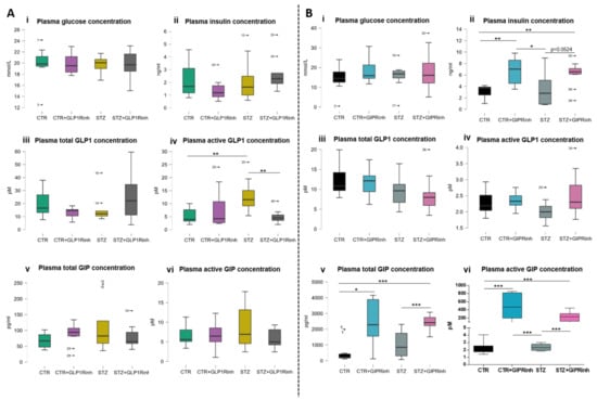 Central inhibition of the GIPR had a stronger impact than GLP-1R inhibition on plasma levels of the measured hormones (Figure 2A,B). Both healthy and STZ-icv-treated rats demonstrated a significant increase of plasma hormone levels after GIPR inhibition—insulin (118%, p = 0.0016 and 73%, p = 0.0524), total (310.9%, p = 0.0343 and 137%, p = 0.0002) and active GIP (212-fold, p = 0.0004, and 96-fold, p < 0.0001), respectively (Figure 2B). In contrast, central GLP-1R inhibition induced no acute changes in plasma hormones in healthy rats but decreased active GLP-1 levels in the STZ-icv group (−61.3%; p = 0.0019) (Figure 2A(iv)). Plasma glucose concentration remained unchanged (plasma glucose concentration in Figure 2(Ai) already published in Supplementary Data S2 []) but the observed concentrations were quite high in each treated group due to the absence of a fasting period and systemic anesthesia. However, the effect on glucose levels could have also been masked by increased baseline glucose concentration due to icv treatment.