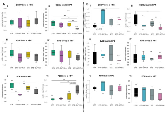 Impact of central glucagon-like peptide-1 and gastric inhibitory polypeptide inhibition on the levels of cytochrome C, cytochrome C oxidase IV, and pyruvate dehydrogenase in the hippocampus and hypothalamus. One month after intracerebroventricular (icv) streptozotocin (STZ) or vehicle (CTR) administration, rats were injected icv with 85 µg/kg of glucagon-like peptide-1 receptor antagonist (Exendin fragment 9–39, GLP1Rinh; experiment 1) or 85 µg/kg of gastric inhibitory polypeptide receptor antagonist (Pro3-GIP, GIPRinh; experiment 2) dissolved in saline or with saline only (CTR and STZ). Animals were sacrificed 30 min after icv administration and the hippocampus (HPC) and hypothalamus (HPT) were dissected, homogenized/sonicated, and protein concentration was measured. Cytochrome C (CytC; iii,iv), cytochrome C oxidase IV (COXIV; i,ii), and pyruvate dehydrogenase (PDH; v,vi) levels in the HPC and HPT were measured by Western blot analysis 30 min after central GLP1R (A) and GIPR (B) inhibition. Values are presented as boxplots with marked outliers and data analyzed by a non-parametric Kruskal–Wallis one-way ANOVA test followed by a Mann–Whitney U test (* p < 0.05; ** p < 0.01).