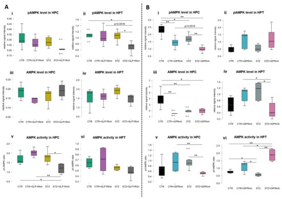 Following GIPR inhibition, there was a pronounced, region-dependent change in signal/activity of AMPK in the control and STZ group. The level of pAMPK was decreased in the HPC of both groups following GIPR inhibition (CTR + GIPRinh vs. CTR, −37.5%, p = 0.0087; STZ + GIPRinh vs. STZ, −25.9%, p = 0.0260; Figure 4B(i)), while the increase observed in the HPT was insignificant (Figure 4B(ii)). The levels of total AMPK after GIPR inhibition were decreased in the HPC of the controls (−59.2%, p = 0.0022) and in the STZ alone group compared to the CTR group (−51.2%, p = 0.0043) (Figure 4B(iii)), while in the HPT, a decrement following GIPR inhibition was found in the STZ group (−55% vs. STZ alone, p = 0.0303; −49.2% vs. CTR + GIPRinh, p = 0.0303) (Figure 4B(iv)). AMPK activity, assessed indirectly by the phospho/total AMPK ratio, was found decreased following GIPR inhibition in the HPC of the STZ group (−46.3%, p = 0.0022 vs. STZ; −46%, p = 0.0043 vs. CTR + GIPRinh) (Figure 4B(v)). In contrast to the HPC (no change in AMPK activity in the STZ alone vs. CTR alone groups), in the HPT, AMPK activity was found decreased in the STZ group compared to the CTR one (−24.1%, p = 0.0152), while after GIPR inhibition it was increased in the STZ group (+228.2% vs. STZ, p = 0.0043; +71.1%, p = 0.0159 vs. CTR + GIPRinh) (Figure 4B(vi)). The only change observed following GLP-1R inhibition was decreased pAMPK level in the HPT of the STZ group (−34% vs. STZ alone, p = 0.0317; −34%, p = 0.0519 vs. CTR + GLP1Rinh) (Figure 4A(ii)) and decreased AMPK activity in the HPC of the STZ group (−34% vs. STZ alone, p = 0.0381; −41.6% vs. CTR + GLP1Rinh, p = 0.0095) (Figure 4A(v)).