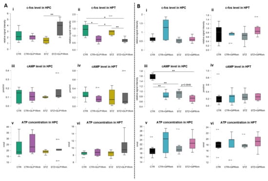 Decrements in cAMP levels were observed following GIPR inhibition in the HPC but not in the HPT, more pronounced in healthy rats (−46% vs. CTR alone, p = 0.0043), and to a much lesser extent in the STZ group (−18.1% vs. STZ alone, p = 0.0649), although the untreated STZ group had significantly decreased cAMP levels compared to the untreated controls (−43.4%, p = 0.0022) (Figure 5B(iii)). In contrast, the c-fos level was changed only after GLP-1R inhibition in both regions; in the HPT, decreased c-fos was observed in both the healthy (−47.1%, p = 0.0411) and STZ group (−49.5%, p = 0.0095) (Figure 5A(ii)) while in the HPC, increased c-fos was measured only in the STZ group (146.6%, p = 0.0087 vs. STZ alone) (Figure 5A(i)). The ATP concentration remained unchanged in both experiments in both brain regions (Figure 5A(v,vi),B(v,vi)).