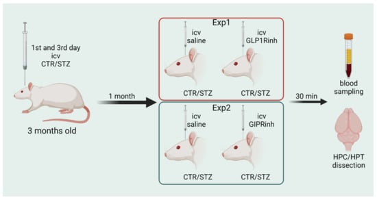 Experimental design. Two experiments with 4 groups each were conducted with the same procedure. Three-month-old male Wistar rats were intracerebroventricularly (icv) injected with streptozotocin (STZ/3 mg/kg) or vehicle only (controls/CTR) on days 1 and 3. In experiment 1 (Exp1) rats were randomly divided into four groups. Two groups (CTR + GLP1Rinh and STZ + GLP1Rinh) received icv 85 µg/kg of glucagon-like peptide-1 receptor antagonist (exendin fragment 9–39, GLP1Rinh) dissolved in saline. In experiment 2 (Exp2), two groups (CTR + GIPRinh and STZ + GIPRinh) received icv 85 µg/kg of gastric inhibitory polypeptide receptor antagonist (Pro3-GIP, GIPRinh) dissolved in saline. The other groups in both experiments (CTR and STZ) received saline only (bilaterally 2 µL/ventricle). All animals were sacrificed 30 min after icv. Blood was sampled and brain was removed and the hippocampus (HPC) and hypothalamus (HPT) were dissected out for further analysis. Figure created with BioRender.com (accessed on 21 December 2021).