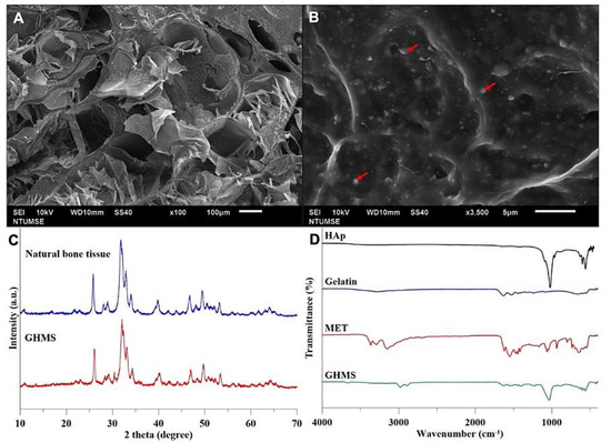 Characterization of Gelatin/Nano-Hydroxyapatite/Metformin scaffold (GHMS). Scanning electron microscopy (SEM) images of GHMS at different magnifications: (A) 100× and (B) 3500× (right). (C) X-ray diffractometry (XRD) patterns of natural bone tissue and GHMS. (D) Fourier transform infrared (FTIR) patterns of conventional hydroxyapatite (HAp), gelatin, metformin (MET), and GHMS (Table 1).