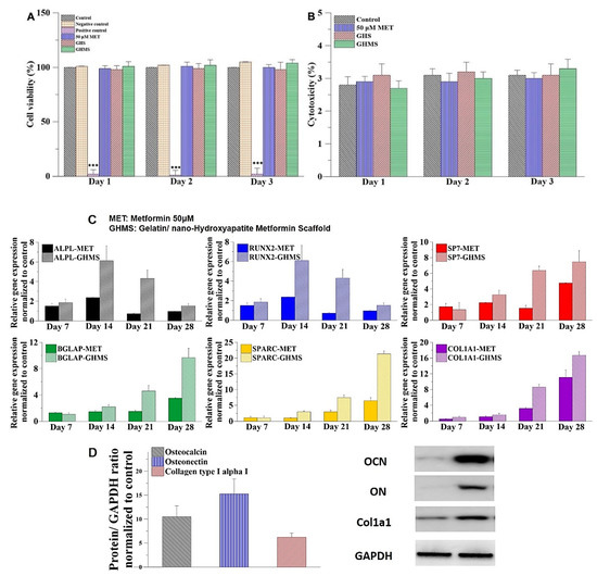 In vitro studies to evaluate the biocompatibility and osteogenic potentials of gelatin/nano-hydroxyapatite/metformin scaffold (GHMS). (A) Water-soluble tetrazolium (WST-1) assay. (n = 12; *** p < 0.001) (B) Extracellular lactate dehydrogenase (LDH) Assay. (C) Osteogenetic gene expression and protein synthesis after coculturing human mesenchymal stem cells (hMSCs) with GHMS or 50 μM metformin (normalized to the control group). The osteoblast-specific genes of the hMSCs, including alkaline phosphatase (ALPL), runt-related transcription factor-2 (RUNX2), osterix (SP7), osteocalcin (BGLAP), osteonectin (SPARC), and type I collagen (COL1A1) were upregulated compared to the control group. (D) Osteogenetic protein synthesis after co-culturing hMSCs with GHMS. The hMSCs co-cultured with the GHMS for four weeks showed osteogenic protein overexpression of osteocalcin (OCN), osteonectin (ON), and collagen type I (Col1a1) compared to the control group.