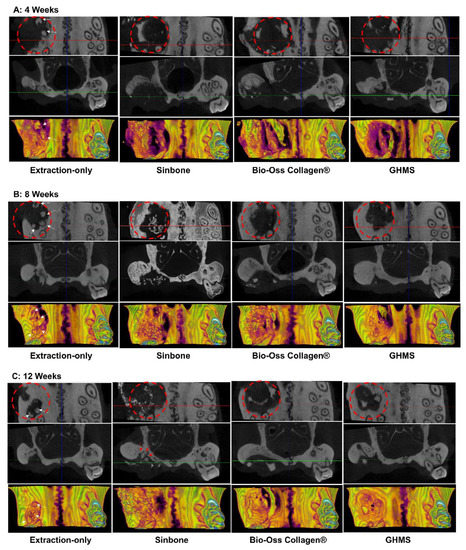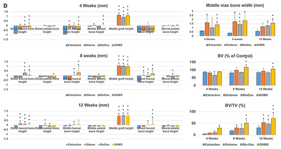 Representatives of the 3D reconstructed and sectioned micro-CT images at bilateral maxillary first molar regions for the four different groups (extraction-only, Sinbone granules, Bio-Oss Collagen®, and GHMS) collected at 4, 8, and 12 weeks are shown in Figure 3A–C. The grafting groups had fuller buccal bone contour and better bone height compared to the extraction-only group. From gross inspection, the extraction group exhibited comparative bone width to but substantially less bone height than the contralateral non-extraction side, while all grafting groups showed considerably larger bone width on the experimental side. Twelve weeks after grafting, the defect sites still presented with significant amount of Sinbone granules and Bio-Oss Collagen®, indicating the slow resorbing nature of these materials, whilst most of the GHMS material had already degraded. The GHMS group showed better new bone regeneration inside the socket/defect (alongside the periphery of the socket/defect underneath the graft material) compared with other groups.
