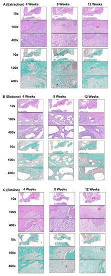Representative histological sections of the maxillary first molar (M1) to third molar (M3) region of rats after M1 (A) extraction or grafting with (B) Sinbone, (C) Bio-Oss Collagen®, or (D) gelatin/nano-hydroxyapatite/metformin (GHMS) by hematoxylin and eosin (H&E) and Goldner’s Trichrome staining at 4, 8, and 12 weeks. At the 12th week after extraction, new bone growth was less evident in the extraction-only group. The defects grafted with Sinbone granules showed a substantial amount of graft material remained in the defect site. Bio-Oss Collagen® showed some bone regeneration in the defect site. In contrast, well-developed new bone and the presence of haversian canals were found in the GHMS sections. In addition, there was no detectable fibrous tissue invasion or inflammatory cells infiltration in the GHMS experimental group. Goldner’s trichrome staining shows significantly less new bone formation in the extraction-only group, whereas immature bone formation and soft tissue invasion were observed in Sinbone. In the GHMS samples, there was a well-developed new bone, and angiogenesis were found. The red box is the position of magnification.