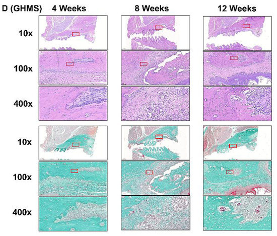Although Sinbone seemed to perform better than Bio-Oss Collagen® in terms of bone volume and bone fill, these results should be interpreted with care. Because the condensed Sinbone granules were in close vicinity to the defect walls and the mineral content of Sinbone was similar to the surrounding bone, there were difficulties in distinguishing between Sinbone and native bone (red arrows in Figure 3C and white arrows in Figure 5B) in micro-CT sections/images [36]. Thus, the micro-CT measurement of Sinbone group may be overestimated. Nevertheless, GHMS still exhibited superior bone regeneration capacity compared with Sinbone when evaluated with micro-CT.