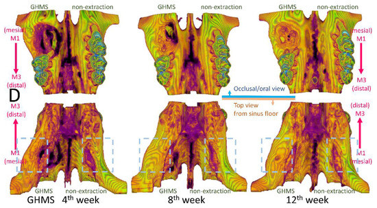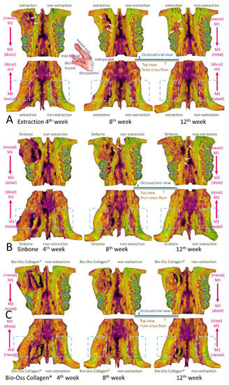 In this study, we showed that all grafting groups preserved bone height, especially at the buccal side, whereas the unassisted extraction group showed considerable loss of buccal bone height. Our study’s grafting groups also showed extreme bone width gain in comparison with the non-extraction control side. The bone volumes (excluding graft material) of GHMS group at 8 and 12 weeks were even greater than the non-extraction contralateral side (BV% of control >100%), indicating that GHMS regenerated bone beyond existing bone limits. This was probably due to the CSD model that we used. In this rat model, we created an extremely large defect in the grafting groups. To a certain extent, this was similar to the clinical scenario of performing alveolar ridge split technique for horizontal bone augmentation [32,33]. The serial transaxial sections on micro-CT clearly showed that the alveolar ridge of the defect/grafting side at M1 bended gradually more outward buccally and upward apically from the most distal section (image at upper left corner) to the mesial section (image at lower right corner). The bone width at the mesial site of M1 appeared to increase significantly more than that at the distal side (blue dashed box in Figure 5). Therefore, even though the defect did not completely fill with new bone, the overall bone volume became larger than the non-extraction side.