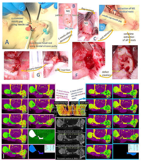All procedures complied with protocols pre-approved by the Institutional Animal Care and Use Committee of National Taiwan University IACUC#20180197). Seventy-two eight-week-old male Wistar rats with average weight of 350 g were randomly assigned to receive extraction-only or grafting at the maxillary first molar (M1) site on one side (experimental side) and the contralateral maxillary M1 served as unmanipulated (non-extraction) control (UCtrl). Rats were anesthetized using 1:2 concentrations of Zoletil and Rompum as previously described [44] with local anesthesia (0.1 mL, 2% lidocaine with 1:100,000 epinephrine) infiltration adjacent to M1 on the experimental side. For the extraction group, M1 was luxated until significant elevation and then extracted using a dental explorer without further enlargement of the extraction sockets. For the grafting groups, decoronation of M1 was first performed using a tungsten carbide round bur (ISO 027, diameter 2.7 mm) with a low-speed dental handpiece (1000 rpm; SM, Osstem, Taiwan) under continuous saline irrigation by removing the crown and perforating the furcation until separation of the roots. After two weeks of secondary soft tissue healing, a semilunar incision was made to expose the alveolar crest of M1 and the remaining roots of M1 were completely removed under the same anesthetic procedure. A standardized critical size alveolar bone defect was created using low-speed tungsten carbide round bur (diameter 2.7 mm) by aiming the center of interradicular septa until the depth that the bur head was just submerged into the soft tissue surface. The bone defects were randomly assigned to be filled with gelatin/nHA/metformin scaffold/sponge (GHMS), Sinbone granules (60%HA + 40%β-TCP; Purzer Pharmaceutical Co., Ltd., Taipei, Taiwan), or Bio-Oss Collagen® (Geistlich Biomaterials, Wolhusen, Switzerland). Primary closure was achieved using resorbable vicryl 6-0 sutures (Figure 6A–H). The rats were euthanized by CO2 asphyxiation and decapitated at designated time points (4, 8, or 12 weeks) after the extraction/grafting procedure (six rats per group per time point). The skull was fixed in 10% formalin for micro-computed tomography (micro-CT) and histological examinations.