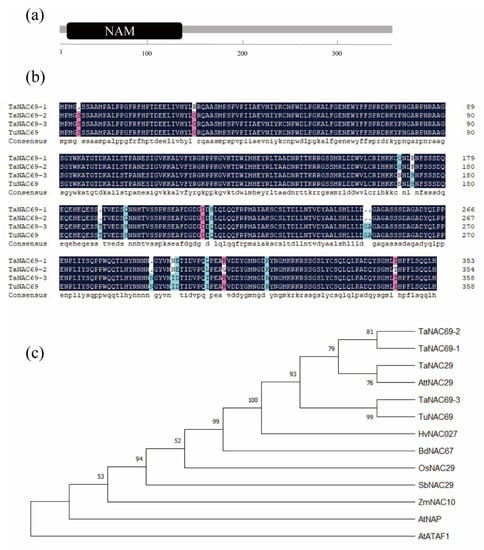 The full length of TuNAC69 coding sequence encodes a protein of 359 amino acids, with a relative molecular weight of about 40 kDa. TuNAC69 has the typical structure of NAC family members, with a conserved N-terminal NAM domain (Figure 2a). In the genome of Triticum aestivum, TaNAC69-1, TaNAC69-2 and TaNAC69-3 are highly similar to TuNAC69 (Figure S1), located on chromosomes 5B, 5D, and 5A, respectively. Compared with them, the TuNAC69 has an amino acid sequence identity of 96.1% with TaNAC69-1, 95.8% with TaNAC69-2, 100% with TaNAC69-3 (Figure 2b). As shown in Figure 2c, the NAC69 homologous are well conserved and presented in different plant species.