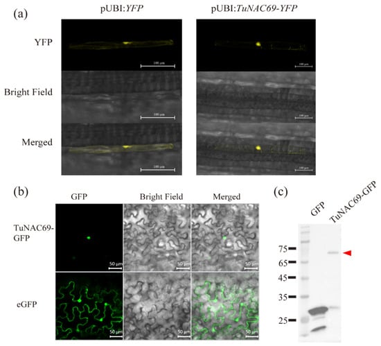 In order to examine the localization of TuNAC69, we created a construct to express TuNAC69 and Green fluorescent protein (GFP) fusion protein, then transiently expressed it in wheat and tobacco Nicotiana benthamiana. TuNAC69 proteins mainly localized in the nucleus in both wheat and N. benthamiana cells (Figure 3a,b), which is consistent with the localization characteristics of transcription factors. Immunoblot analysis indicated that TuNAC69-GFP protein was correctly expressed in N. benthamiana (Figure 3c).