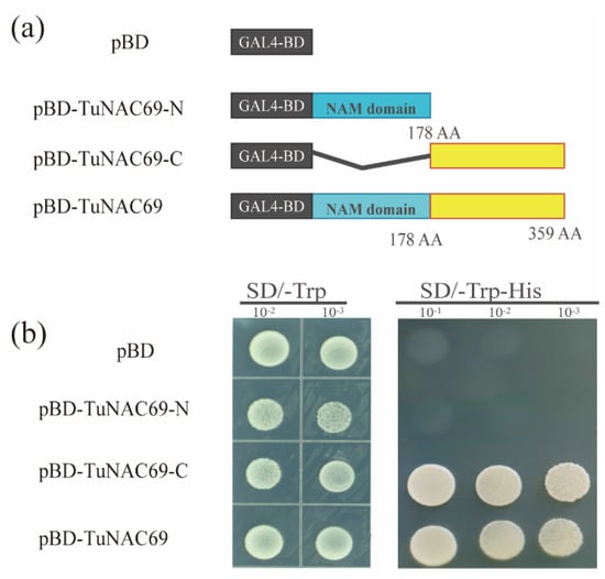 Full length of TuNAC69, the N-terminal of TuNAC69 (1–531 bp) and the C-terminal of TuNAC69 (531–1077 bp) were cloned into pGBKT7, respectively. And the derived recombinant plasmids were separately transformed into Saccharomyces cerevisiae strain AH109. Transformed cells were cultured in SD/-Trp and SD/-Trp/-His, respectively, at 30 °C as described [,].