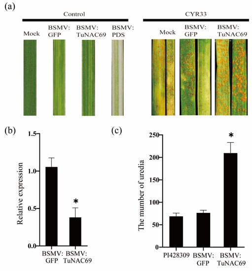 Barley stripe mosaic virus (BSMV)-induced silencing of TuNAC69 compromised the resistance of PI428309 to Pst CYR33. (a) PI428309 was inoculated with the BSMV on the second leaf. Inoculated with urediniospores of Pst CYR33 on the fourth leaf after 21 days. Leaves infected with Pst CYR33 were examined at 14 dpi. (b) The transcript levels of TuNAC69 were examined by quantitative reverse transcription PCR (qRT-PCR). TuACTIN was used as an internal control. (c) The number of uredia per cm2 on wheat leaves. Error bars represent ± SD of values obtained from at least three independent biological samples. Statistically significant difference (Student’s t-test): *, p < 0.05.
