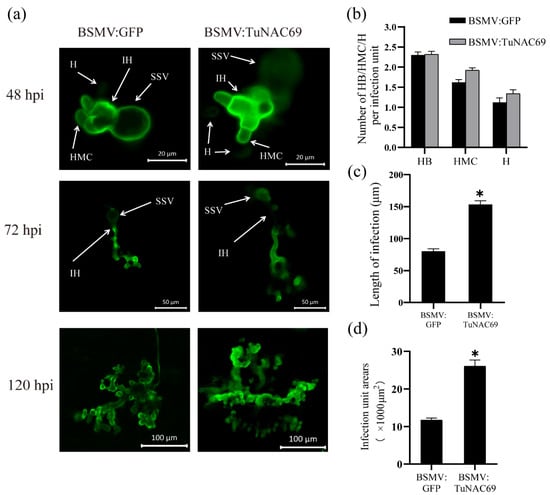 In addition, to further characterize the stripe resistance, the infected leaves of wheat were taken at 48 hpi, 72 hpi and 120 hpi, and the mycelium of Pst was stained with wheat germ agglutinin (WGA), and the fungal growth was examined by confocal microscope. The number of hyphal branches (HB), haustorial mother cells (HMC) and haustoria (H) at 48 hpi were counted, respectively. The length of infection hyphae at 72 hpi infection and the infection unit area at 120 hpi were also measured []. As shown in Figure 6b, there was no significant difference, in the number of HB, HMC and H, between the TuNAC69 silenced plants and the control group. However, the length of infection hyphae and the infection unit area in TuNAC69 silenced plants were significantly larger than those in the control group (Figure 6c,d). Taken together, those results indicated that TuNAC69 plays a positive role in the resistance of PI428309 to stripe rust.