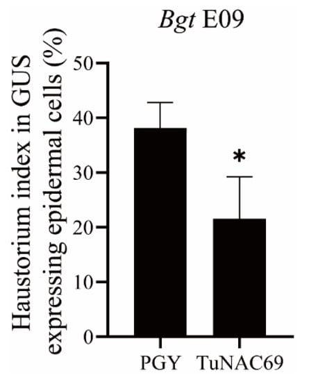 The single-cell transient expression assay was performed as described previously []. The reporter plasmid containing β-glucuronidase (GUS) gene was mixed with plasmid pUBI:PGY or pUBI:TuNAC69 (molar ratio 1:1; total DNA less than 2.5 μg) to express transiently in epidermal cells of wheat leaves by biolistic delivery. Leaves were incubated in GUS staining solution for about 12 h at 37 °C at 2 dpi. And then the samples were decolored and observed. The haustorium index was determined as the percentage of number of spores that developed haustorium in effective spores and the experiment was repeated three times independently, each observing at least 40 interactions.