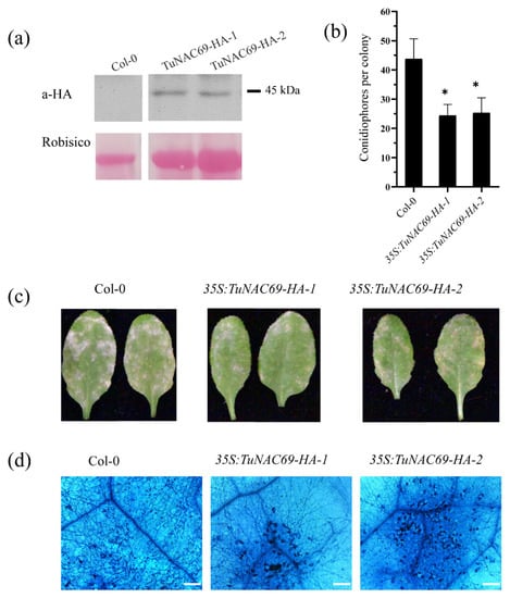To further study the role of TuNAC69 in disease resistance, we overexpressed TuNAC69 in the model plant Arabidopsis thaliana, and infected plants with powdery mildew fungus. The TuNAC69 fused with a HA tag was driven by 35S promoter, and was transformed to Arabidopsis thaliana accession Col-0. As shown in Figure 8a, the TuNAC69-HA protein was properly accumulated. Two independent transgenic plants overexpressing TuNAC69 (35S:TuNAC69-HA-1, 2) were inoculated with powdery mildew fungus G. cichoracearum, and the number of conidiophores was counted at 5 dpi. As shown in Figure 8b, the conidiophores per colony in overexpressed plants were significantly lower than that of control plants (Figure 8b). In 7 dpi, the leaves of the two representative overexpressed lines supported much less growth of powdery mildew fungi, and displayed some necrotic cell death (Figure 8c,d). These results indicate that overexpression of TuNAC69 in Arabidopsis thaliana can increase the resistance to G. cichoracearum and lead to cell death in plants.