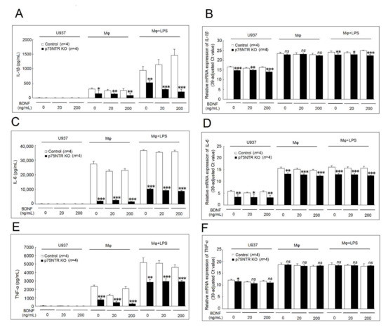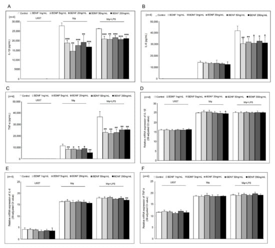 2.1. Effects of BDNF on IL-1β, IL-6, and TNF-α Secretion and mRNA Expression in U937 Cells, Differentiated Macrophages, and Lipopolysaccharide (LPS)-Stimulated Macrophages
