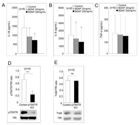 - Liang, J.; Deng, G.; Huang, H. The activation of BDNF reduced inflammation in a spinal cord injury model by TrkB/p38 MAPK signaling. Exp. Ther. Med. 2019, 17, 1688–1696. [Google Scholar] [CrossRef] [Green Version]