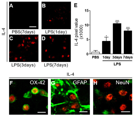 To investigate whether LPS could induce interleukin-4 (IL-4) protein expression in the striatum, sections adjacent to those used for OX-42 immunostaining were processed for immunohistochemical staining using antibodies against IL-4. Immunohistochemical analysis showed no expression of IL-4 in PBS-injected striatum (Figure 2A,E). By marked contrast, LPS produced the expression of IL-4 as early as 1 day post LPS (Figure 2B,E), maximal at 3 days post LPS (Figure 2C,E), and was maintained up to 7 days post LPS (Figure 2D,E). Expression of IL-4 was analyzed in OX-42+ microglia, GFAP+ astrocytes, and NeuN+ neurons at 3 days post LPS. Immunohistochemical analysis revealed expression of IL-4 exclusively in OX-42+ microglia (Figure 2F), but not in GFAP+ astrocytes (Figure 2G), nor in NeuN+ neurons (Figure 2H) in the LPS-injected striatum.