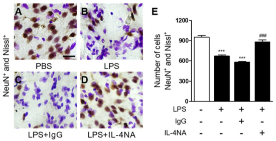 To explore the potential function of endogenous IL-4 on striatal neurons, LPS was unilaterally co-injected with IL-4 neutralizing antibody (IL-4NA) to block the function of IL-4 into the striatum. Seven days later, similar to those shown in Figure 1, immunohistochemical analysis revealed a significant loss of Nissl+/NeuN+ cells in the LPS-injected striatum (Figure 3B,E), compared to the PBS-injected control (Figure 3A,E). By contrast, treatment with IL-4NA prevented the LPS-induced degeneration of Nissl+/NeuN+ cells in the striatum (Figure 3D,E), compared to the LPS-injected, IgG-treated striatum as a control (Figure 3C,E). Treatment with non-specific IgG alone had no effects on NeuN+/Nissl+ cells in the striatum (data not shown). Our recent work demonstrated no neurotoxic action of IL-4NA in a hippocampus treated with prothrombin kringle-2(pKr-2)+/IL-4NA+ and IL-4NA only (pKr-2-/IL-4NA+) [29]. In addition, the present results (Figure 3 and Figure 4) show a lack of neurotoxicity in the group of LPS−/IgG+, which might be comparable to those treated with LPS-/IL4-NA+. It is, therefore, likely that IL-4NA seems to be not toxic in the LPS-treated striatum, although we did not provide direct evidence in the striatum treated with LPS-/IL-4NA+.