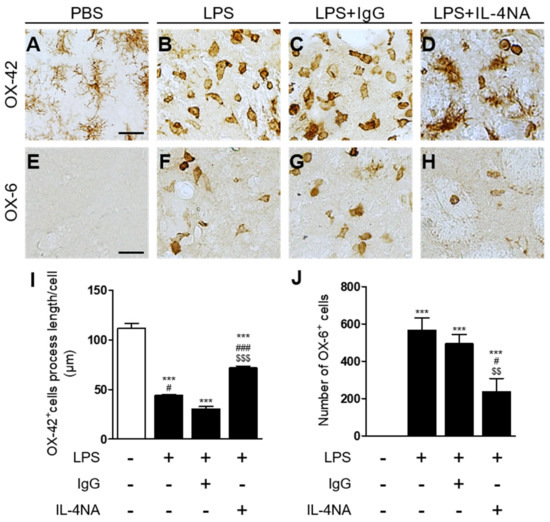 IL-4 regulates activation of microglia in the LPS-injected substantia nigra [25] and prothrombin kringle-2-treated CA1 layer of the hippocampus [30]. Accordingly, we examined whether IL-4 could activate microglia in the LPS-injected striatum in vivo. Three days later, immunohistochemical analysis demonstrated that LPS produced microglial activation with a significant decrease in the OX-42+ cell process length (Figure 4B,I) in the striatum, compared to the PBS-injected control (Figure 4A,I). By contrast, treatment with IL-4NA prevented LPS-induced microglial activation, as determined by the OX-42+ cell process length in the striatum (Figure 4D,I), compared to the LPS-injected, IgG-treated striatum as a control (Figure 4C,I). Similar to OX-42+ cells, LPS increased the number of OX-6+ cells in the striatum (Figure 4F,J), compared to the PBS-injected control (Figure 4E,J). However, treatment with IL-4NA attenuated LPS-induced increases in the number of OX-6+ cells in the striatum (Figure 4H,J), compared to the LPS-injected, IgG-treated striatum as a control (Figure 4G,J). Treatment with non-specific IgG alone had no effects on microglia/macrophage cells in the striatum (data not shown).