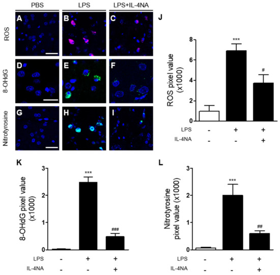 As IL-4 is associated with oxidative stress in the prothrombin kringle-2-injected hippocampus [29] and cortex [30], we hypothesized that IL-4 could induce oxidative/nitrosative stress in the LPS-treated striatum in vivo. To test this, we examined whether IL-4NA altered the effects of LPS on oxidative/nitrosative stress by analyzing levels of reactive oxygen species (ROS) (O2−) production, DNA oxidation, and protein nitration at 3 days post LPS. Hydroethidine histochemical analysis demonstrated that LPS injection increased O2− production in the striatum in vivo (Figure 5B,J), compared to the PBS-injected control (Figure 5A,J). By contrast, treatment with IL-4NA significantly reduced LPS-induced O2− production in the striatum (Figure 5C,J). For DNA oxidation, 8-OHdG levels were measured in the LPS-injected striatum in the presence or absence of IL-4NA. Immunohistochemical analysis showed that LPS injection increased the levels of 8-OHdG in the striatum (Figure 5E,K), compared to the PBS-injected control (Figure 5D,K). Treatment with IL-4NA partially mitigated the LPS-induced levels of 8-OHdG (Figure 5F,K). For protein nitration, analysis by nitrotyrosine revealed that LPS injection increased protein nitration (Figure 5H,L), compared with the PBS-injected control (Figure 5G,L). Treatment with IL-4NA attenuated the increase in levels of nitrotyrosine due to LPS injection (Figure 5I,L).