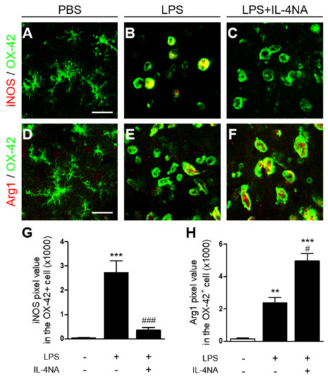 LPS induces microglial activation and microglial polarization in the substantia nigra [32]. Accordingly, we investigated whether LPS could induce microglia/macrophage polarization in the stratum in vivo by analyzing expression of iNOS and arginase 1 as an M1 and M2 marker, respectively. Immunohistochemical analysis revealed that iNOS expression in OX-42+ microglia/macrophages increased 25-fold in the LPS-injected striatum (Figure 6B,G, p < 0.001), compared to the PBS-injected control (Figure 6A,G). Expression of arginase 1 in OX-42+ microglia/macrophages increased 20-fold in the LPS-injected striatum (Figure 6E,H, p < 0.01), compared to the PBS-injected control (Figure 6D,H). Next, we examined whether IL-4 could influence LPS-induced polarization of microglia/macrophages in the striatum, resulting in neurodegeneration (Figure 3) and microglia/macrophage activation (Figure 4). Functional inhibition of IL-4 by IL-4NA significantly attenuated expression of iNOS on OX-42+ microglia/macrophages in the LPS-injected striatum (Figure 6C,G, p < 0.001), compared to LPS alone (Figure 6B,G). By contrast, IL-4NA treatment significantly increased arginase 1 expression on OX-42+ microglia/macrophages in the LPS-injected striatum (Figure 6F,H, p < 0.001), compared to LPS alone (Figure 6E,H). Taken together, these results suggest that IL-4 regulates LPS-induced polarization of microglia/macrophages by shifting from the M2 to the M1 state, resulting in neurodegeneration.